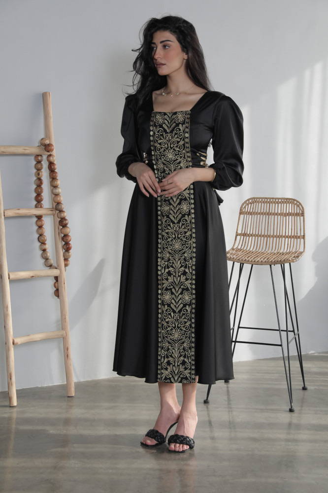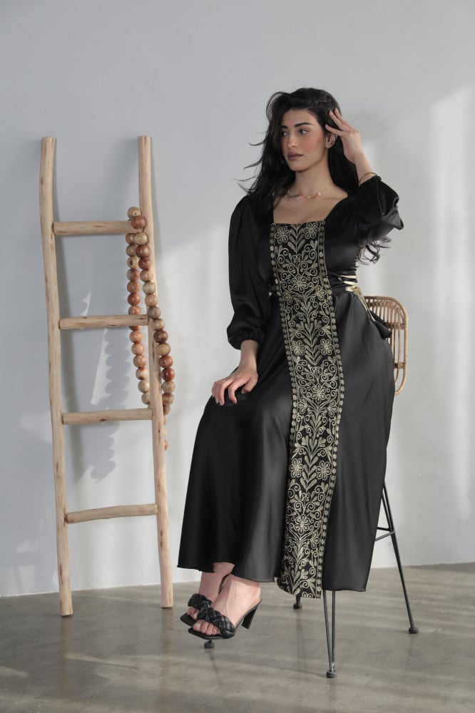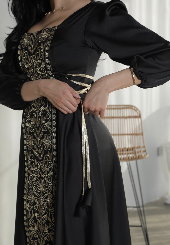 والتطريز الذهبي مع احزمة شد على الجوانب .