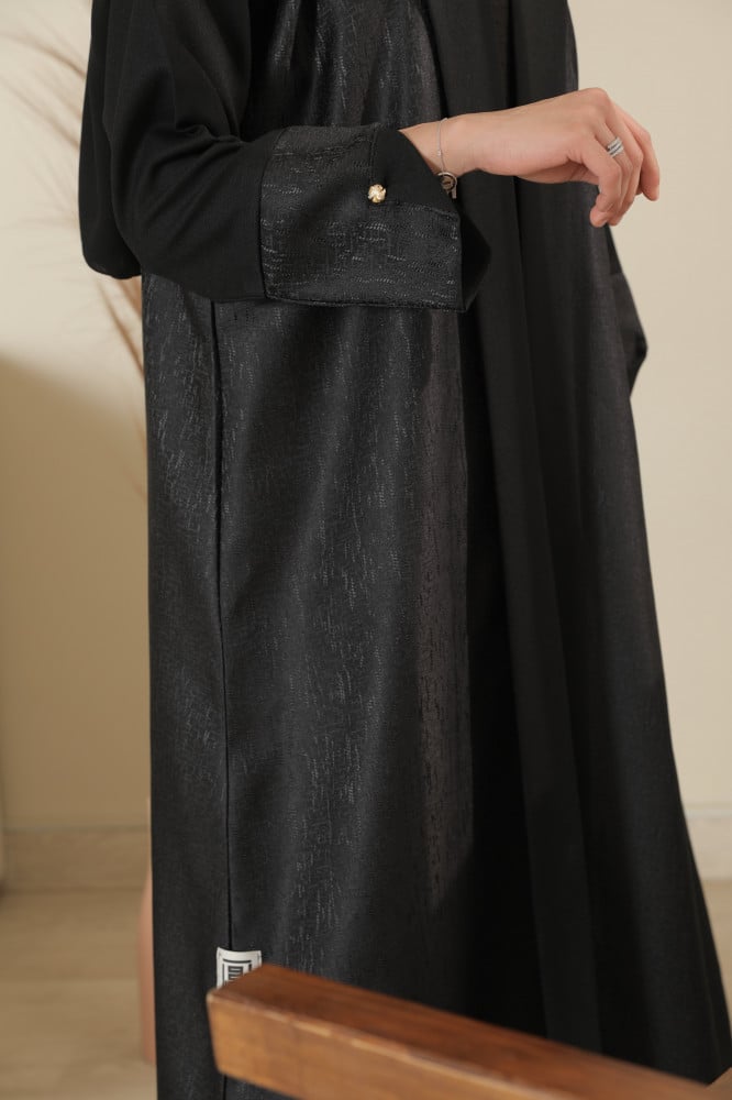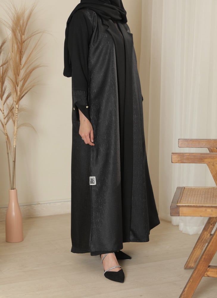 تمتعي بالحصول على اجمل العبايات الراقية من متجرنا ,عباية صيفية بخامة قماش الشانتون اللامعتأتيك بطرحة باللون الاسود .
