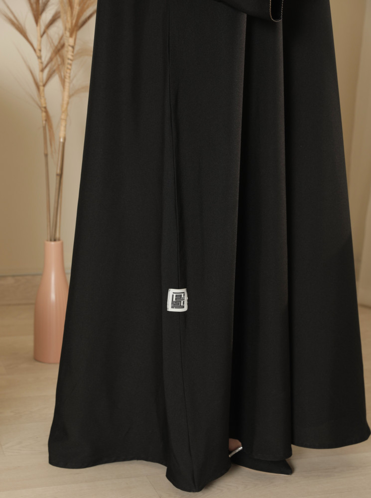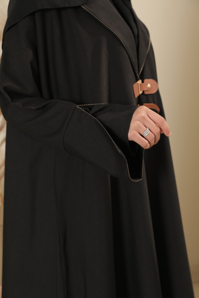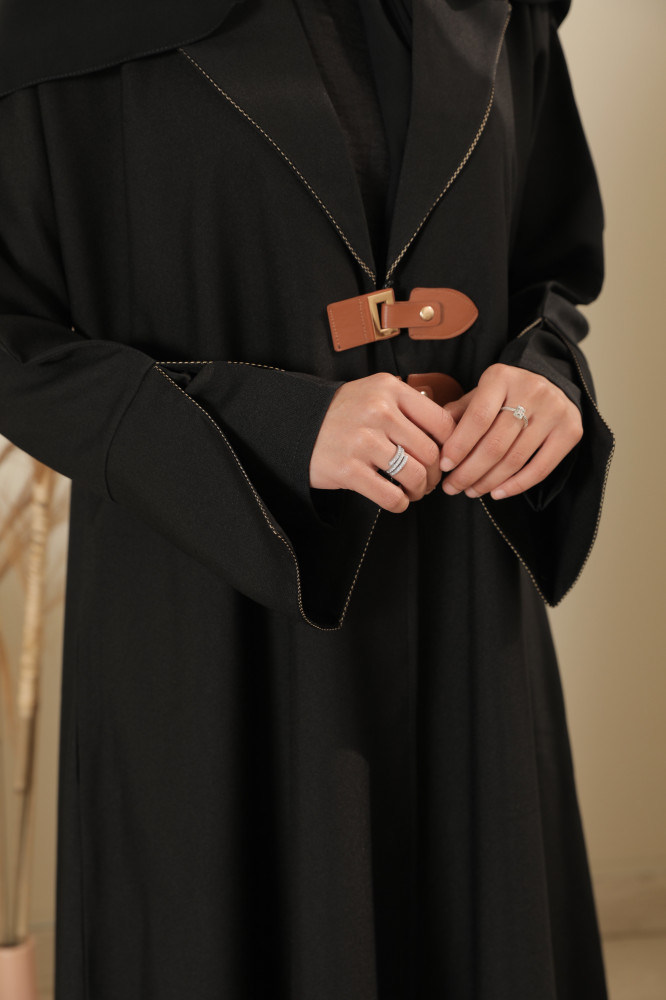 عباية صيفية بخامة القماش الملكي , بأقفال الجلد البنيه وقصة اكمام مميزة