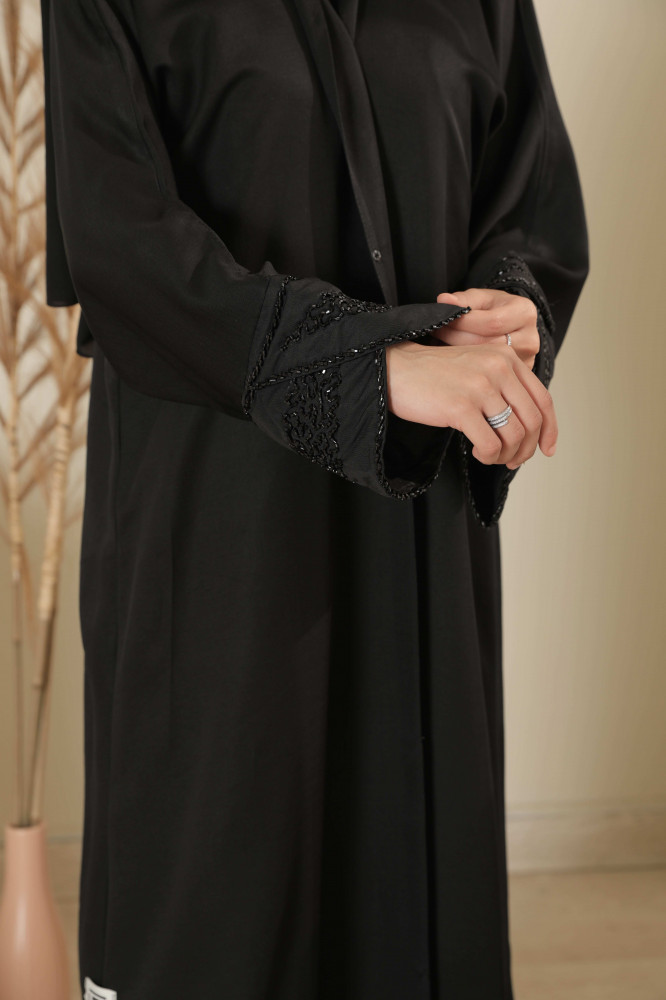 عباية صيفية بخامة القماش الملكي بقصة النص كلوش واكمام مشكوكة بالخرز الاسود